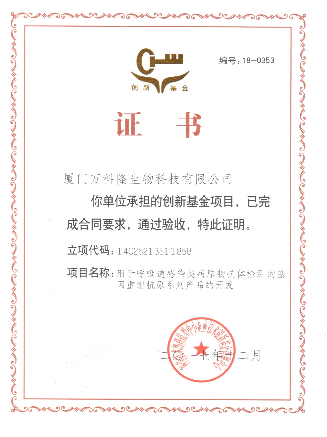 科技型中小企業(yè)技術(shù)創(chuàng)新基金立項證書